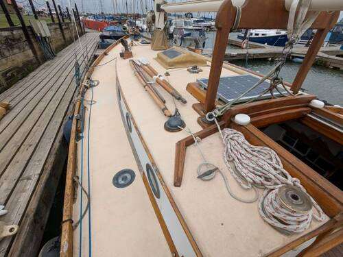 Keel/Hull: Displacement hull with a centre board, external keel and transom-hung rudder. History & Construction: Idle Duck Is a Maurice Griffiths One Off Classic designed yacht. Maurice explained its conception in a three-page article reprinted by Yachting Monthly in July 1973. Built in 1962 by James Miller & Sons, a Scottish Yard renowned for their high standard in constructing Yachts and Fishing boats. The monohull has a Carvel constructed hull which is heavily built using 1 3/8”Iroko planks fastened with copper roves over 2” x 1 1/2” English Oak frames closely spaced at 7” centres with 2 1/2” x 3/8” Bronze floor frames at every 3rd frame. The outside lead ballasted centre board keel weighs about 2.35 tons and, when raised, gives the yacht a draft of 3’ 6” and 6’ 3” when fully down. It can be raised and lowered from the cockpit. Only a small part of the case protrudes in the cabin sole and forms part of the support for the drop leaf table. The case also has a small hatch in the top above the water line, which can be opened while afloat to give access to the lifting tackle or to force the board down to clear mud or stones after lying aground. There is a preventer system built in, which in the unlikely event of a shackle or pendant failure the board cannot swing right down and be damaged or lost. The yacht now has a masthead Bermudan Sloop rig with wooden spars supported by all Stainless steel stays. The vessel benefits from a furling headsail, Slab reefing main sail rigged with lazy jacks and stack pack. There is a substantial wooden bow sprit supported between mooring posts which provides secure storage for the main anchor and gives the foredeck a purposeful appearance. The current owners enlisted the skills of shipwright Alan Staley based at his yard at Faversham Creek (Kent) in 2006 - 2010 to complete a major restoration and upgrade of Idle Duck with no expense spared shortly after they purchased her. The work involved the sympathetic remodelling of the coach roof and cockpit which involved the installation of new beams, a butterfly opening hatch, a complete new deck and repairs to the hull planking. Once launched the boat was rewired and modernised with new navigation and safety equipment. This yacht captured the hearts of many classic enthusiasts as they watched her restoration. Additional photos of Idle Duck as it is today can be viewed along with those covering the full restoration when viewing the vessel or on the brokers web site. There is also a copy of the Yachting Monthly article available on request. Below decks the accommodation is straightforward with a traditional fine finish and plenty of space for living quarters for four people with standing headroom throughout. The cabin feels light and airy with ample room for people to relax around the table for meals and drinks in the evenings. The Perkins 4.107 diesel engine can give a fair 7 knots, and carries enough fuel for approximately 50 hours running at a cruising speed of 6 knots. This yacht is being sold as the owner has passed away, and she now requires a new loving owner to take care of her. Marine Insurance: As one of the UK’s largest Brokers with over 700 boats for sale we can introduce you to Boat Insurance providers that offer all types of Boat Insurance, including insurance for Yachts, Sailing Boats, Motor Cruisers, Narrowboats, Inland Waterway Craft, Barges, Houseboats, Speedboats, Rigid Inflatable Boats, Waterski Boats, Jet Skis, Personal Watercraft and Dinghies. Just click on the following link to request an insurance quote for this boat or your current boat: *** Mechanical : Spars & Sails: Mast Head Bermudan rig with a Single spreader wooden mast and boom, stainless steel standing rigging, Terylene Mainsail with slab reefing lazy Jacks, Stacker pack and a roller furling headsail. Winches: 2 x Sheet Winches – Gibb 8CR 2 x Halyard Winches – Barlow 2 x Cockpit mounted Coaming Winches – Barlow Sails: 1 x Mainsail - Good Condition, Last Valeted April 2025 1 x Furling Head Sail - Good Condition, Last Valeted April 2025 1 x Boom Cover - Good Condition, Last Valeted April 2025 Additional Sails: 1 x Hank on Jib - Age unknown, useable condition 1 x Spare Mainsail - Age unknown, useable condition 1 x Spare Head Sail - Age unknown, useable condition Mechanical Systems: Propelling Idle Duck is a single 4-cylinder 36hp Perkins 4.107 diesel engine, paired with a shaft-driven fixed propeller and controlled by a single lever Morse control mounted in the cockpit. Engine Instruments and Ignition are mounted on front bulk head at forward end of cockpit. Electrical Systems: There are five 12-volt Lead Acid Batteries, One assigned solely for the engine starting and three 110 Ah Domestic Batteries Plus an additional battery mounted at the bow for the Anchor windlass. Charging for all the batteries is supplied from the engine alternator which has been modified for use with a Sterling external regulator, solar panel and charge regulator, and a Shore Power 240v 20amp battery charger. Isolation and the charge distribution is managed via the VSR relay system. The State of Charge for all batteries is monitored at the Navigation station via two NASA BM 1 + 2 battery monitors. This Yacht also benefits from a Shore power 240-Volt ring main with sockets in the saloon and forepeak.