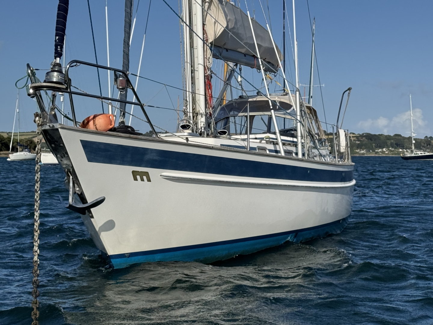 - Off white gel coat with navy style stripe on coach roof and waterline