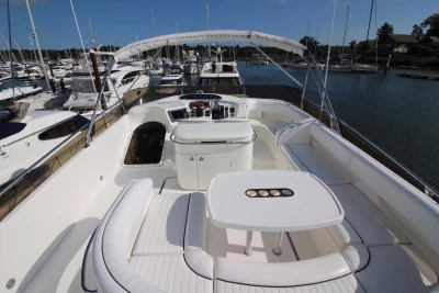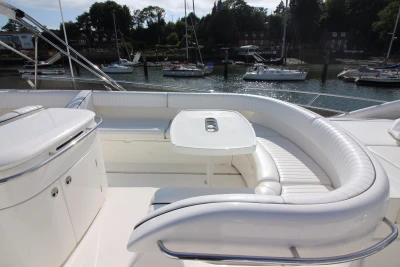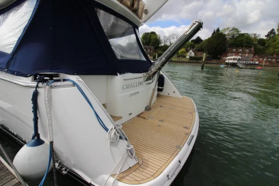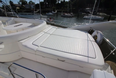 - Teak-laid cockpit deck, transom platform, flybridge stairway and side decks