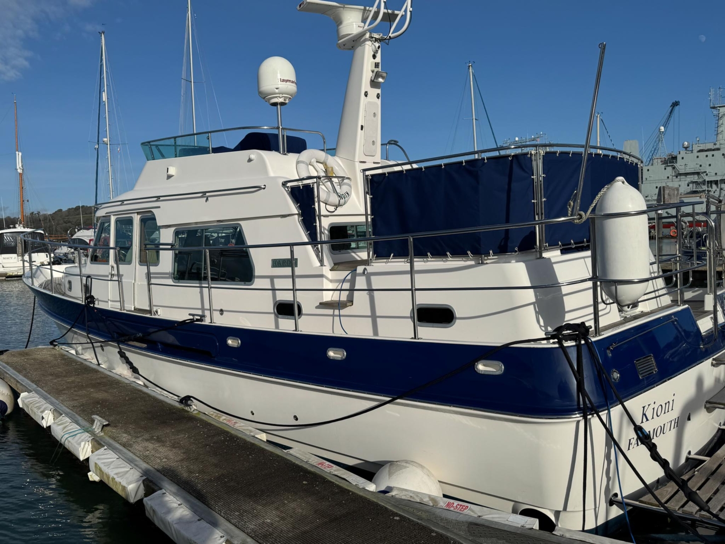 - Exterior – Wide safe one level walk round decks with bulwarks and solid high s/s guard rail. Side and stern gate boarding points. Aft gate leads to boarding platform. Large lazerette aft deck storage locker. Quarter deck access from port and stbd., storage lockers, table and seating. From quarter deck access to flybridge. Central upper helm position with navigational and engine instruments. Extensive lockers for storage of flybridge seating cushions (all new upholstery 2020)