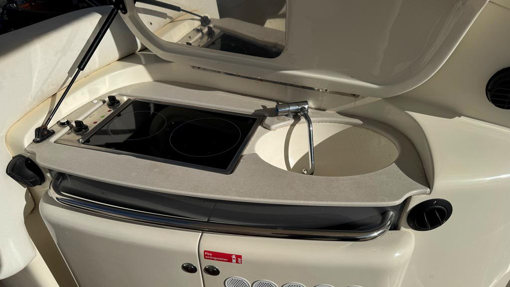 - COCKPIT: large sunbathing pad (6’6″) with cushions over dinghy garage. Spacious U shaped seating area to port around varnished teak table with ample room for 6-8 people. Outside wet bar to starboard equipped with electric BBQ plate, sink and fridge. Further sunbathing on forward coachroof.