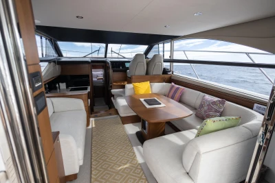- Deck saloon with U-shaped sofa with dining table to starboard and two seater sofa on port side
