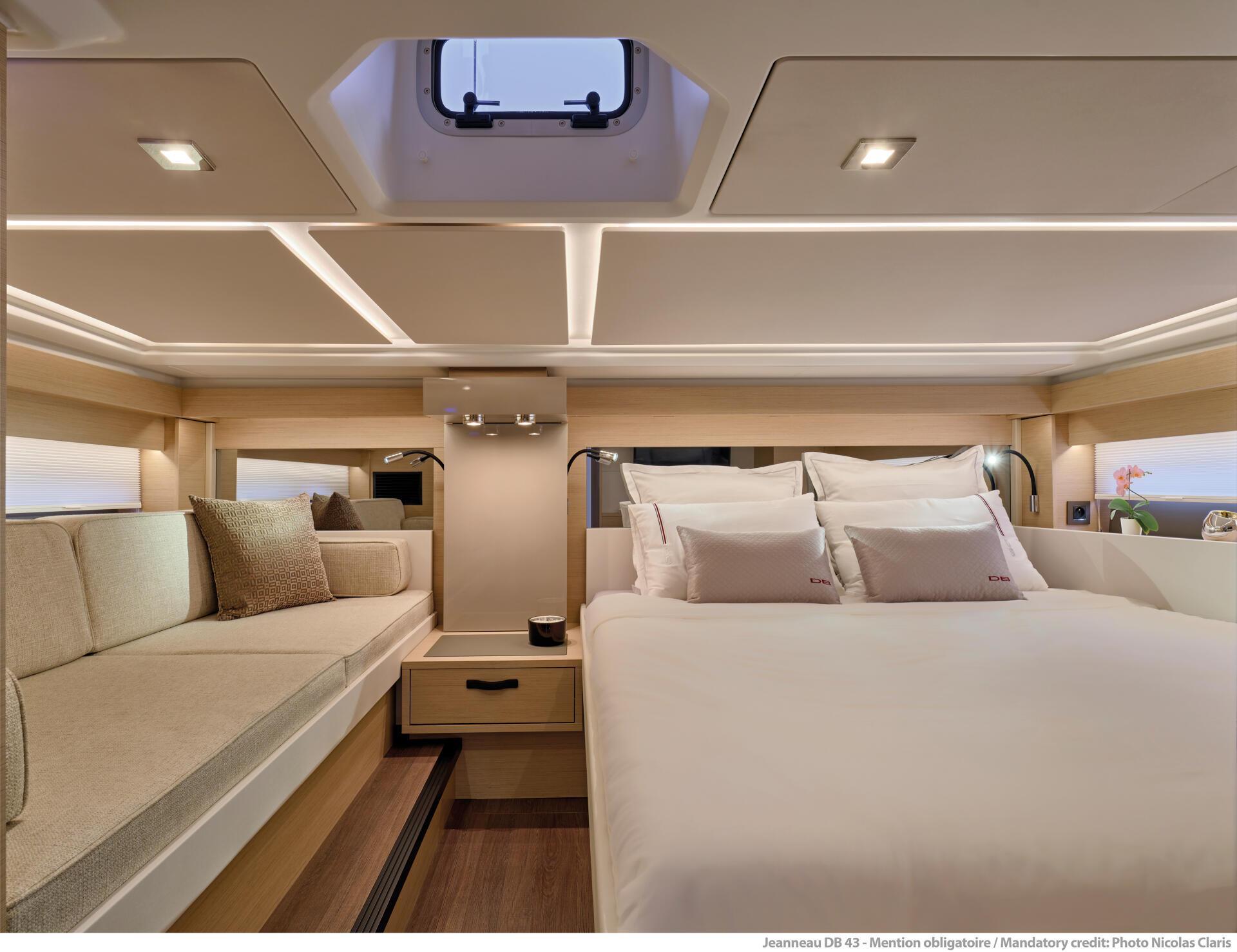 New spec: description = The all new Jeanneau DB/43 IB available for pre-order. The DB/43 is designed for cruisers seeking a boat with solid, seaworthy qualities and an assertive personality, yet open and inviting. On board, comfort is prioritized, and careful attention to fit and finish attest to Jeanneau’s savoir-faire in the construction of premium models. The design of the DB/43 was entrusted to Italian designer, Camillo Garroni, who conceived its soft curves and extended lines.These decisions give the DB/43 a distinguished, sporty look from every vantage point. With its versatile concept, the new DB/43 is designed to facilitate shared moments for up to twelve people on board. Open to the sea, the design of the DB/43 sets it apart. The two opening side terraces and airy deck plan reinforce the feeling of spaciousness. They enable you to create a true Beach Club atmosphere, with direct access to the water for swimming. Part exchange is available. Call 01473 225710 to register your interest